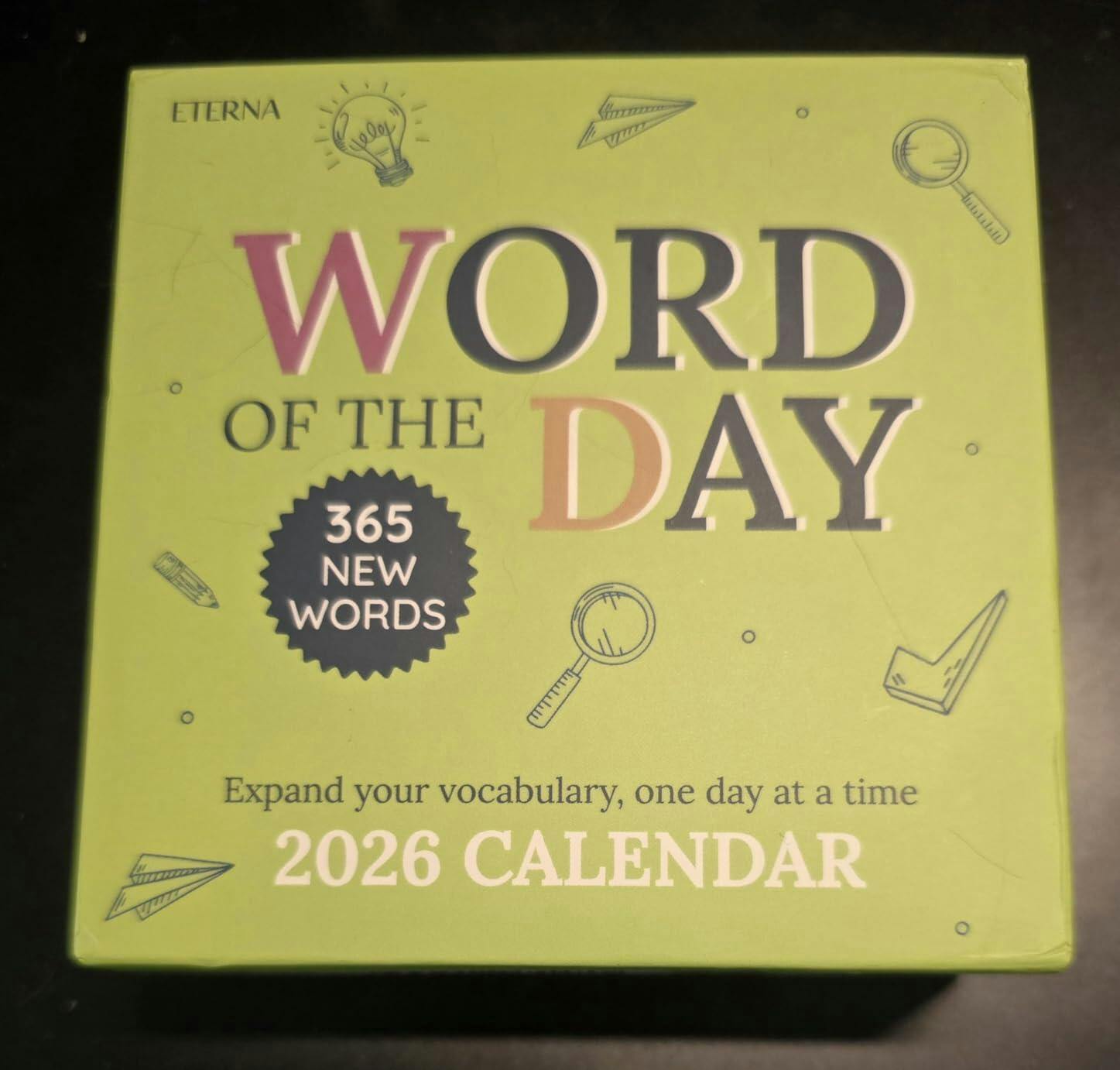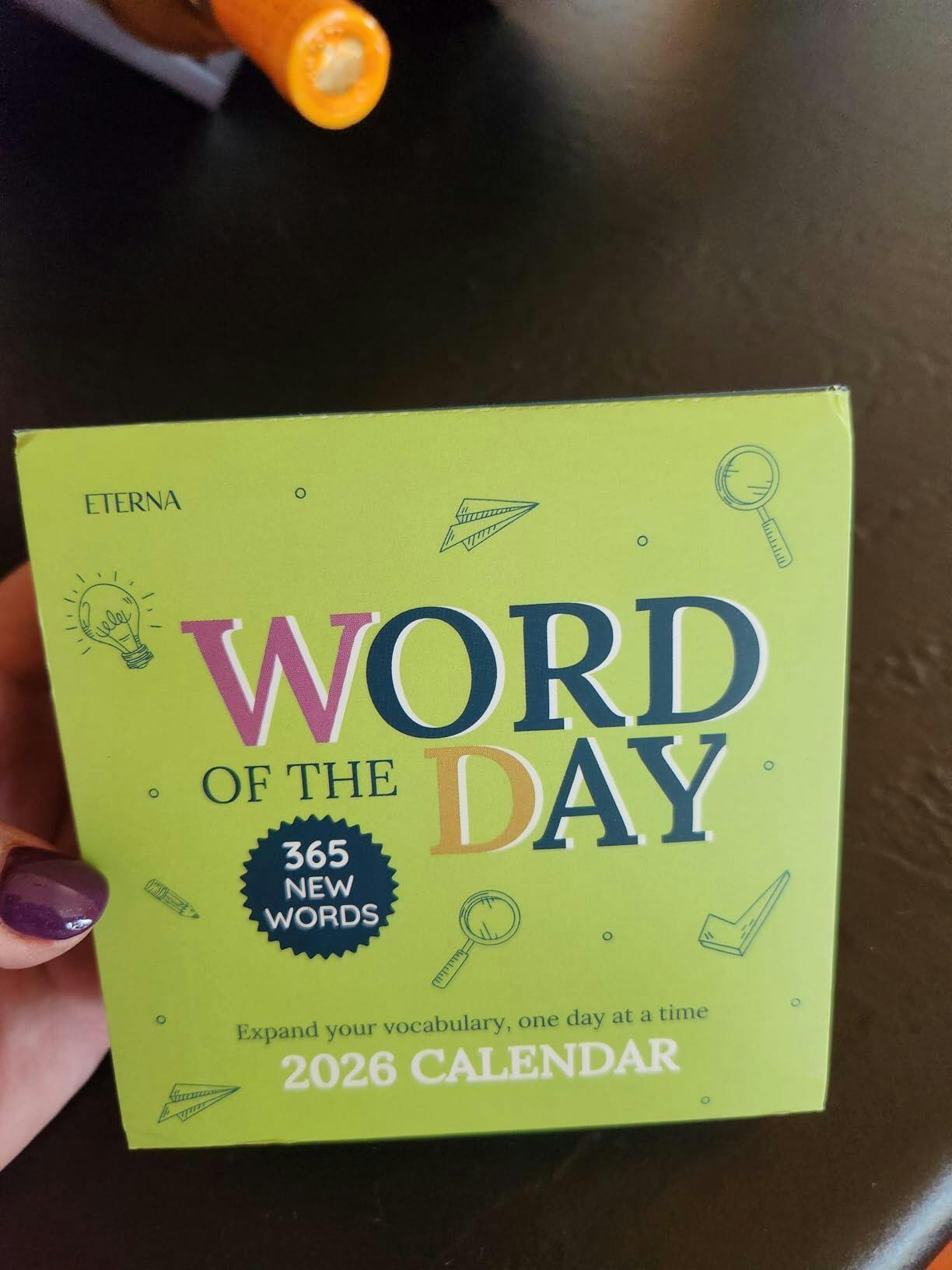 The words span quite a bit from more common (troll) to more rare (hiraeth).The backside of each page has lines for notes, I love re-using the torn off pages for jotting things down at work.This is a smaller sized 4x4 calendar that won't take up a lot of space, but the font colorings and size are an awkward choice, the date print is smaller at the top and in the orange color, so it's not easy to read at a glance, they should have made the date way more prominent.