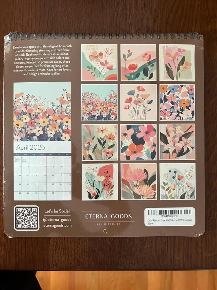 I absolutely love each and every floral design in this calendar - almost to the point of framing a bunch of the prints and hanging them on my walls. Each print is soothing, relaxing and just lovely...The calendar size is large but not overwhelmingly huge, there's plenty of space to mark events and appts., the spiral binding sits perfectly flat on any space - wall, fridge or wallboard and I love that I can easily remove each print month by month to frame the art.Bottom-line: Excellent price for a truly lovely and elegant floral print calendar that can be reused as framed prints for yourself or as gifts.